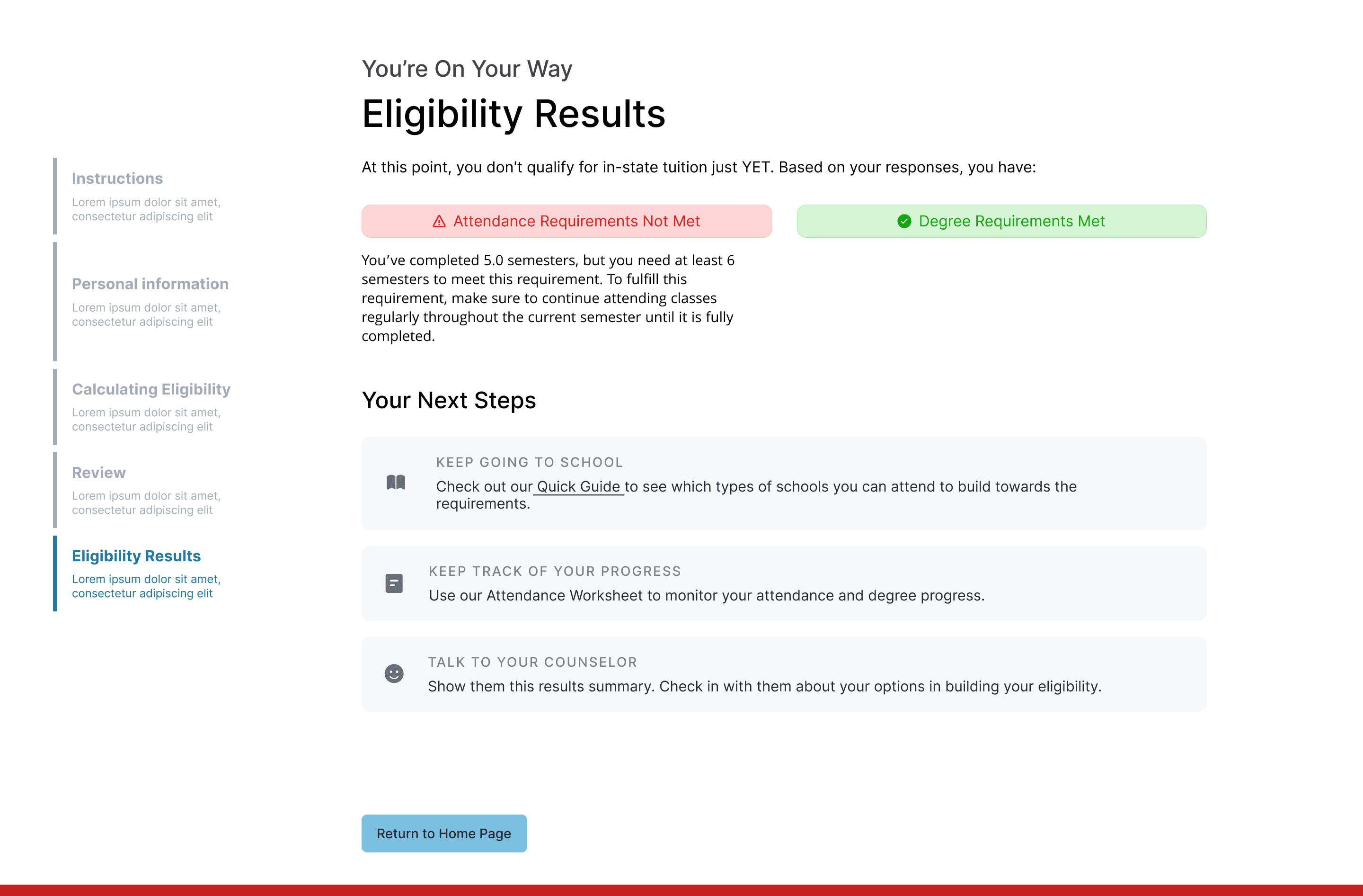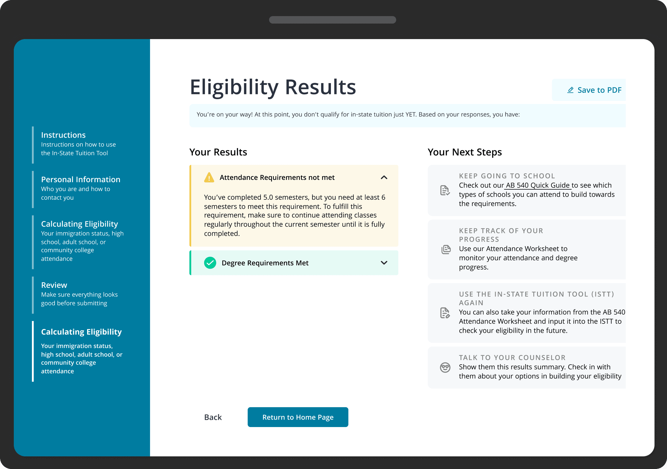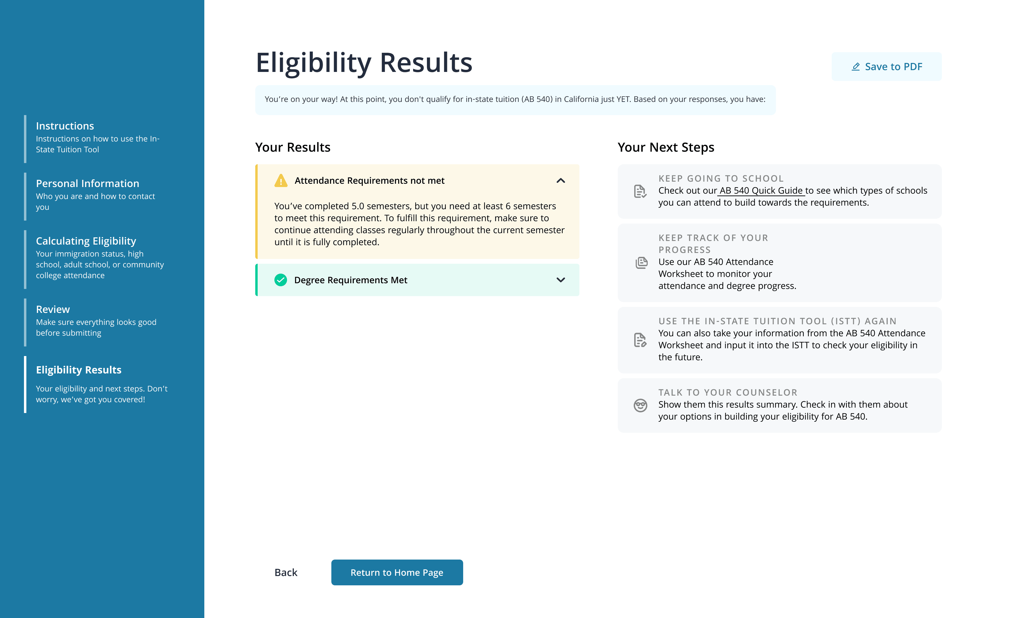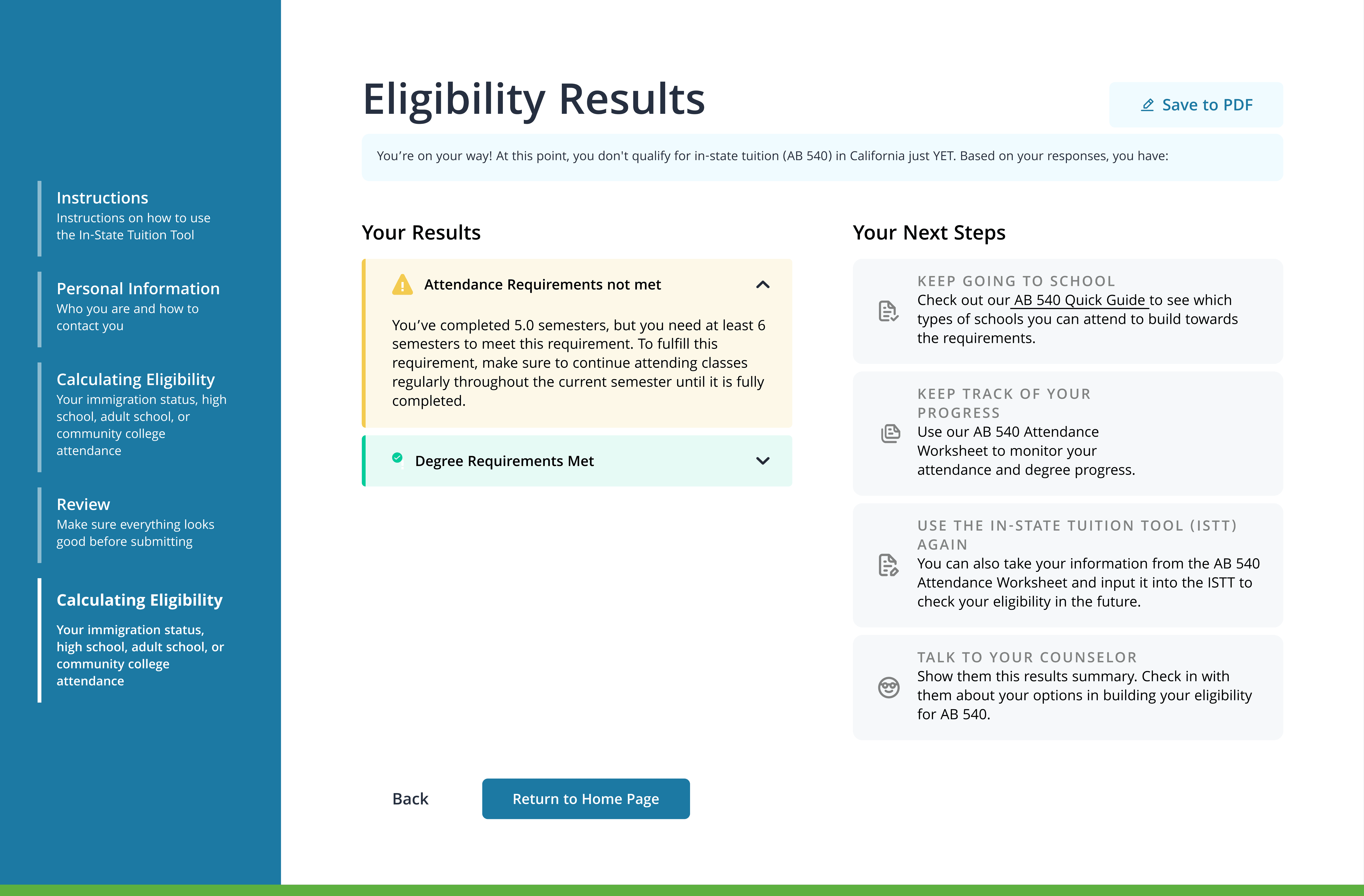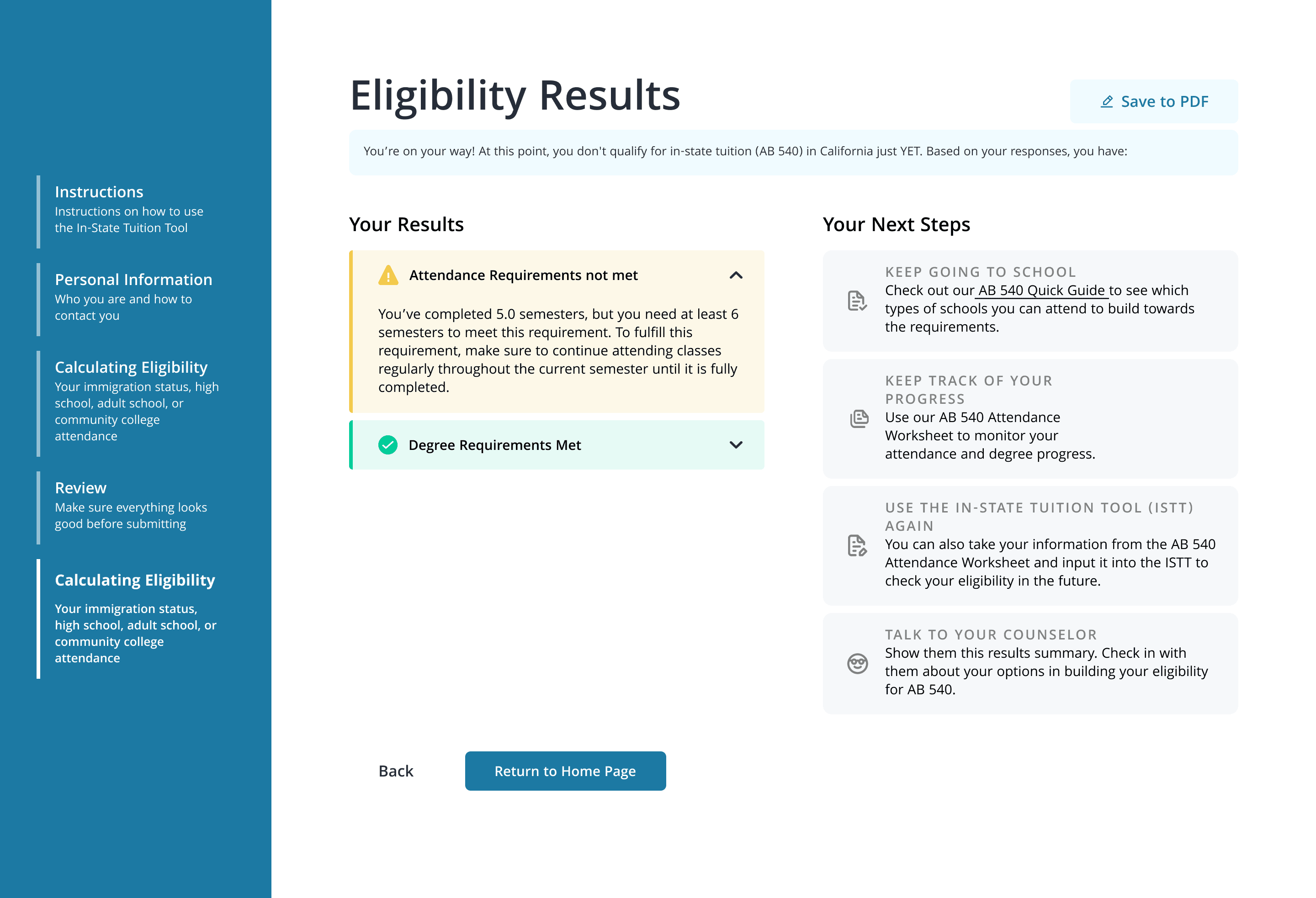 The ISTT calculates eligibility and explains why the student qualifies or not. In addition, the tool offers next steps for students who do not qualify. This significantly improves the user experience as many students struggle to understand how to qualify, necessitating a step-by-step guide integrated into the tool.