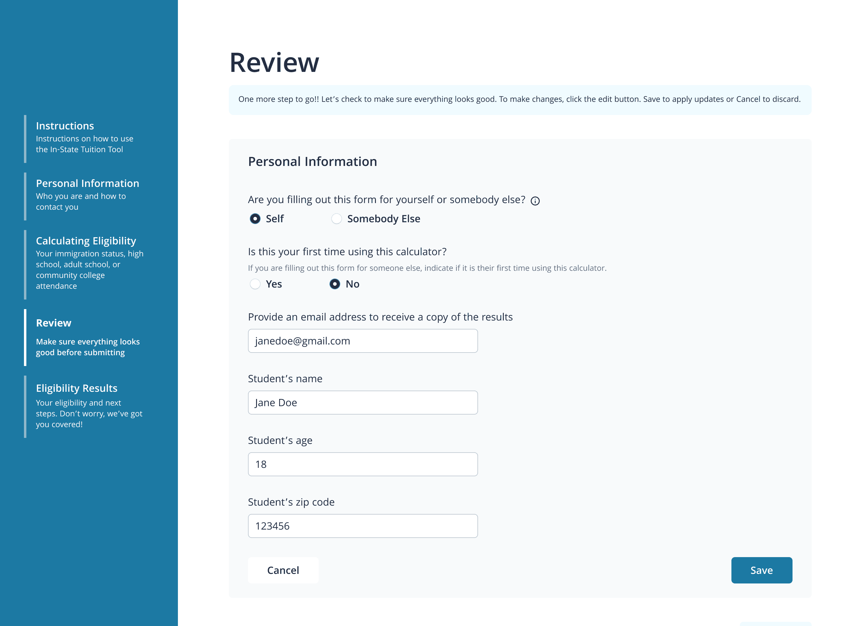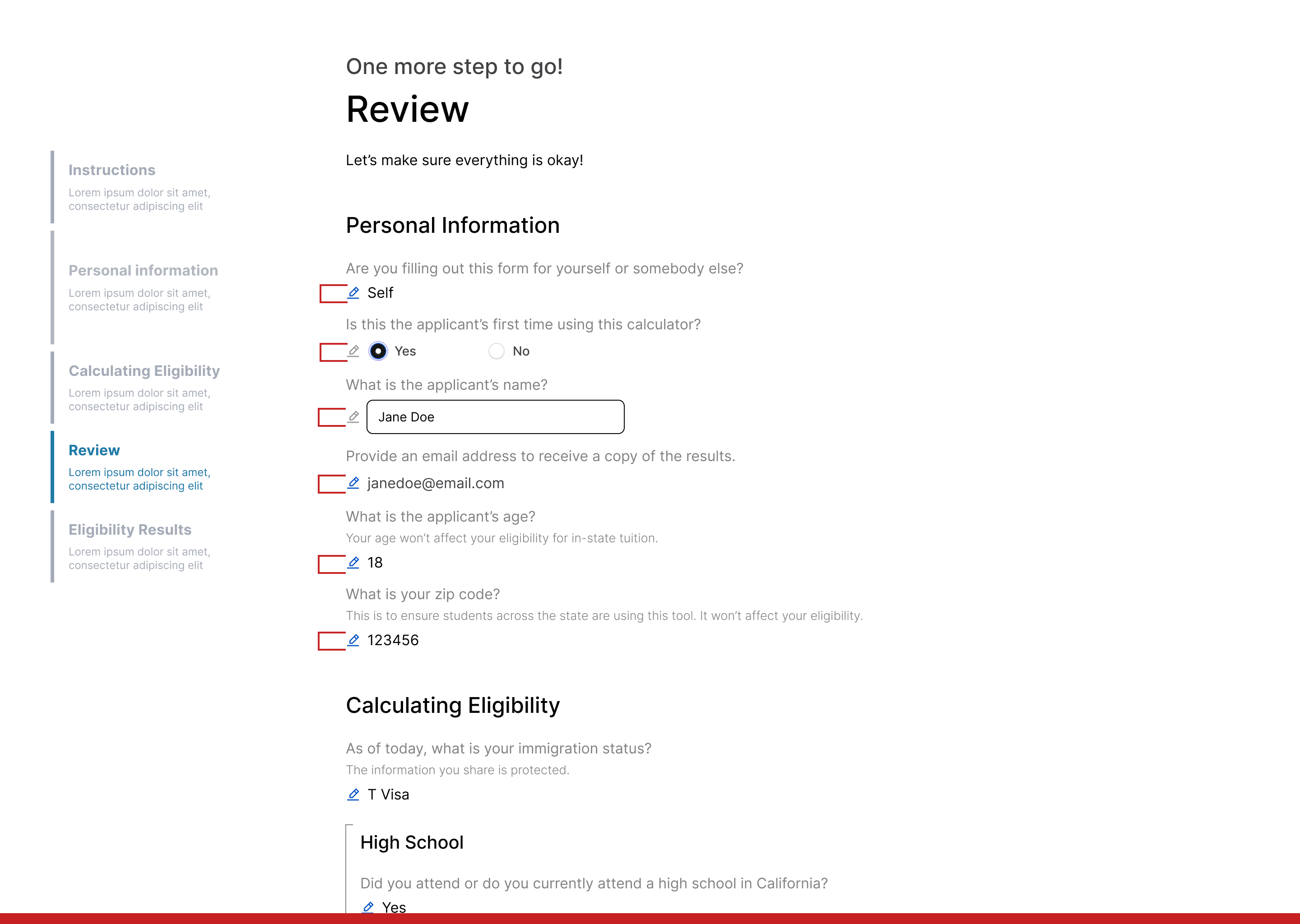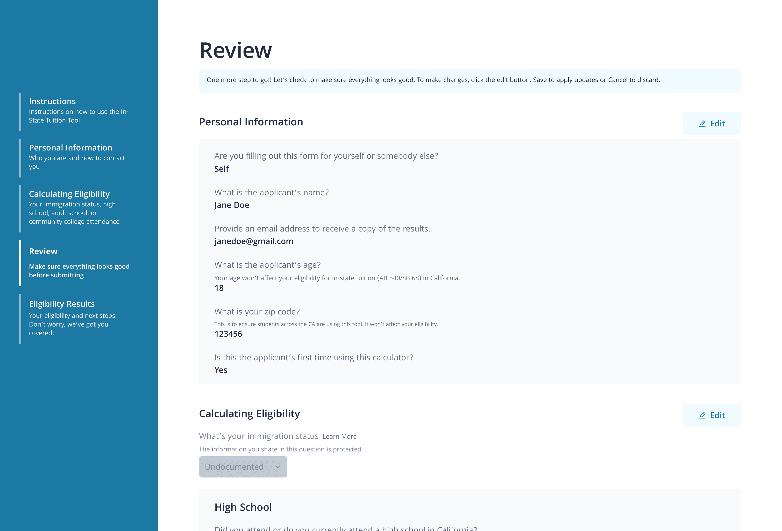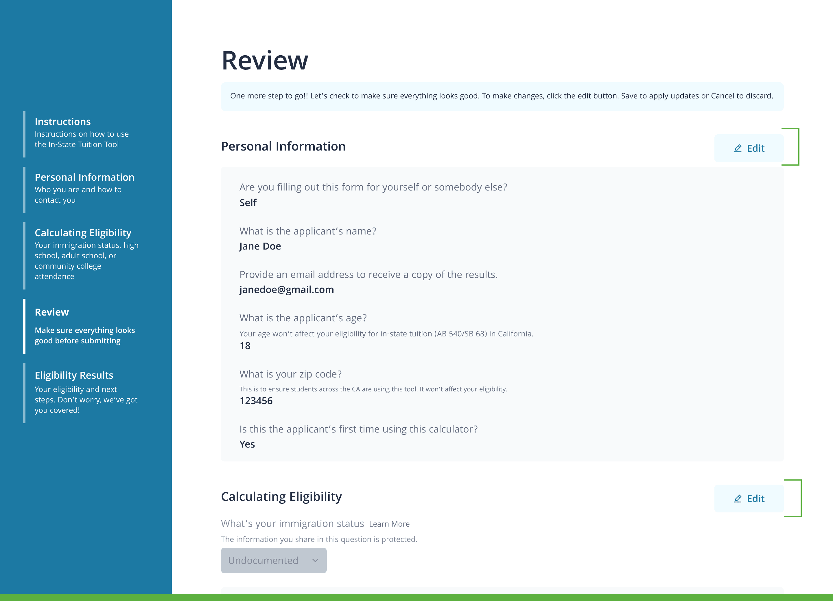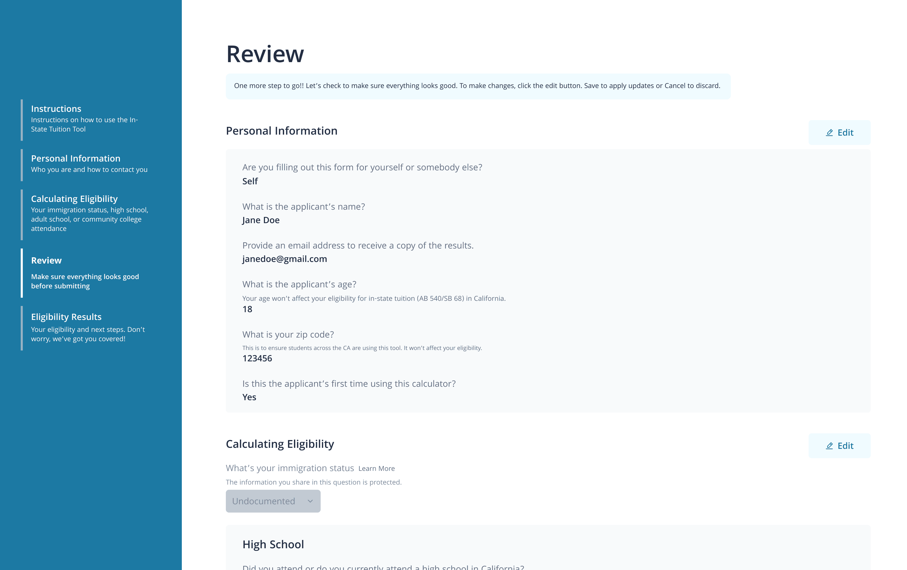 We also added a review page so users can review and edit their information without navigating back and forth through the form. This aims to reduce errors.