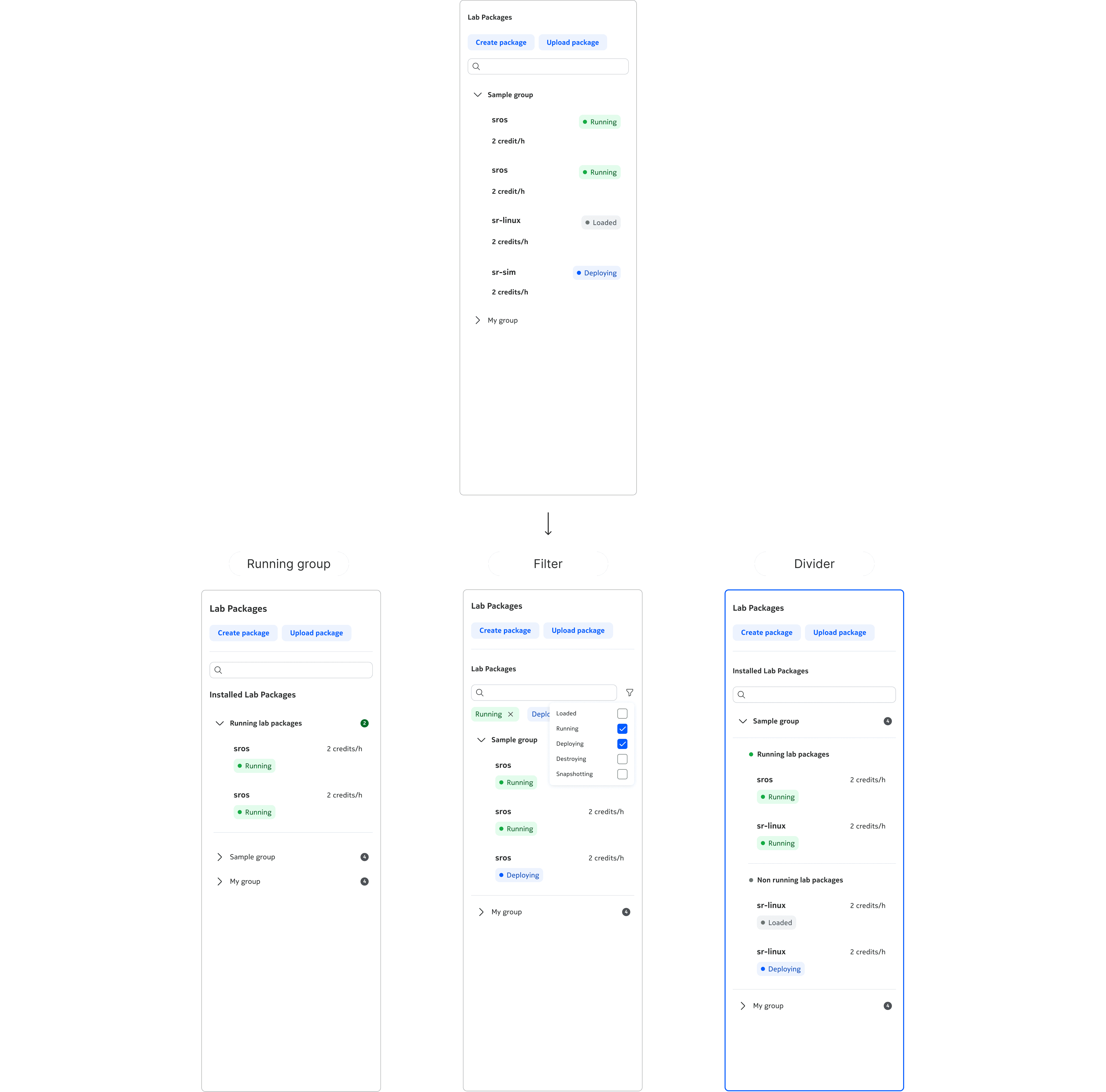 In V2, I organized all lab package related actions into the panel. I also grouped lab packages to create clearer hierarchy, and added a search to improve discovery of lab packages.
