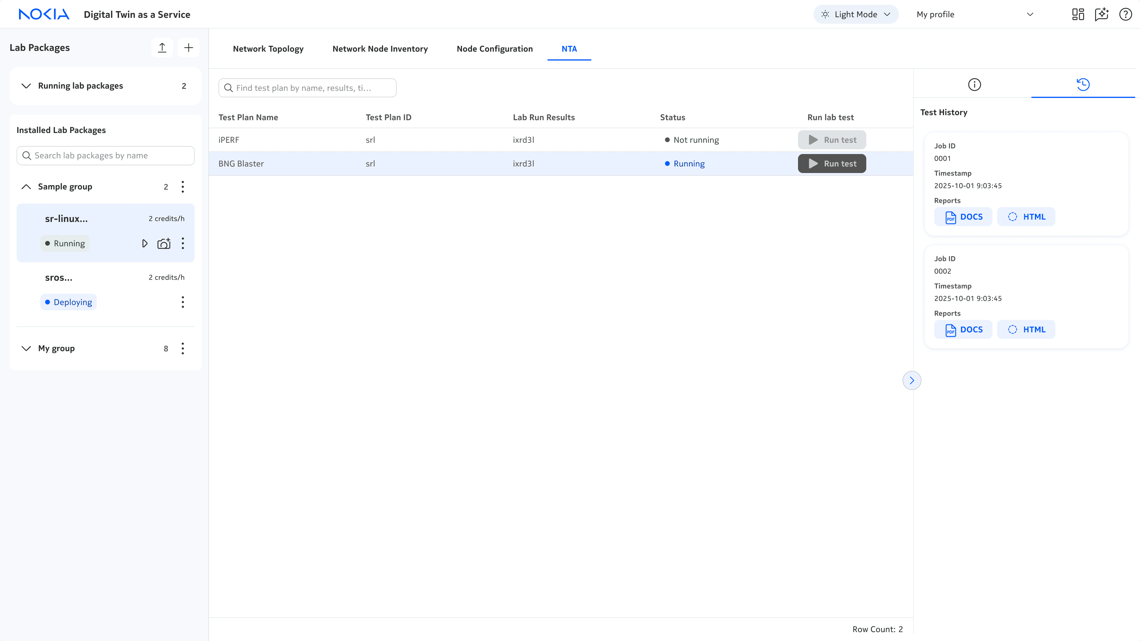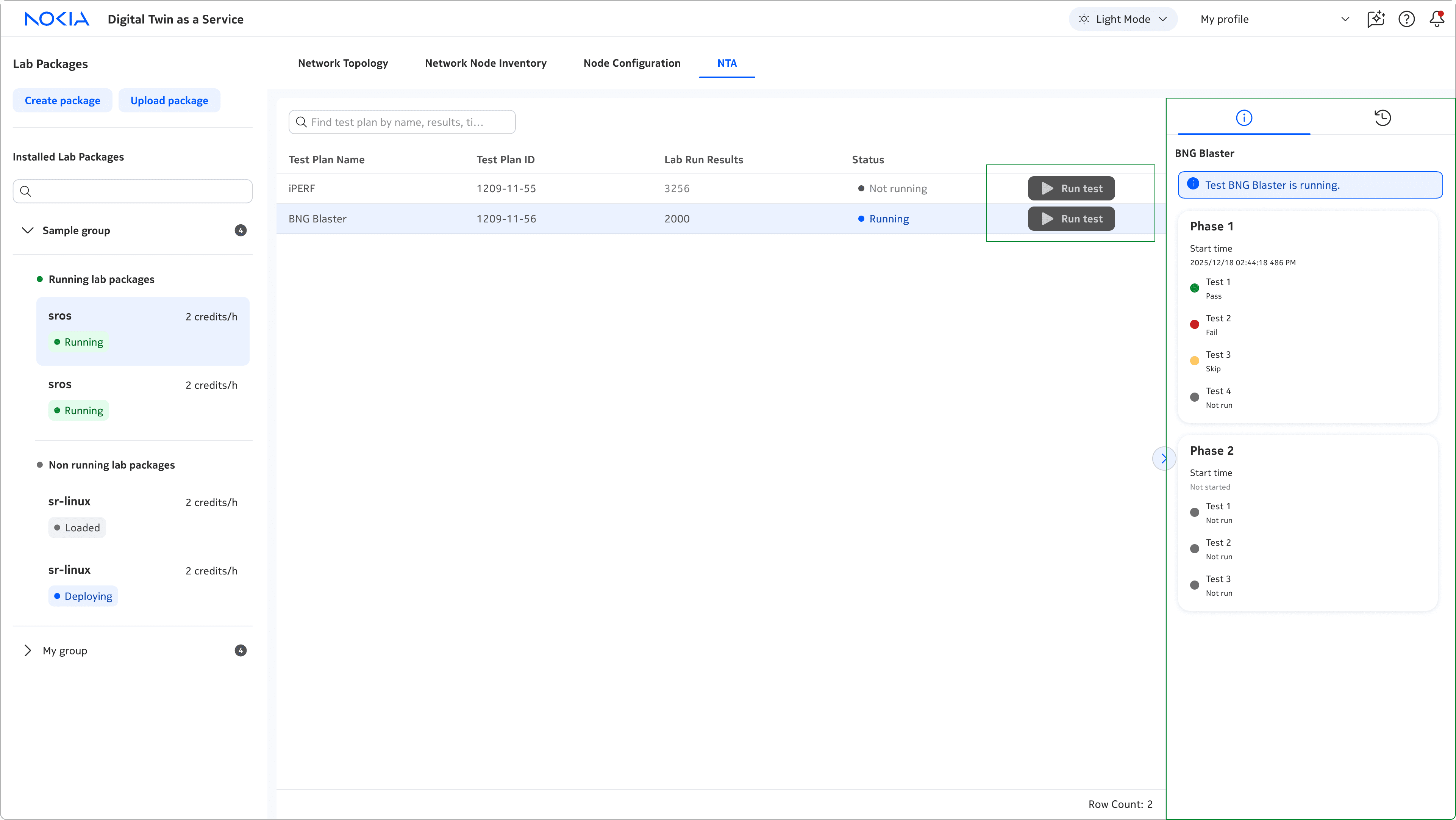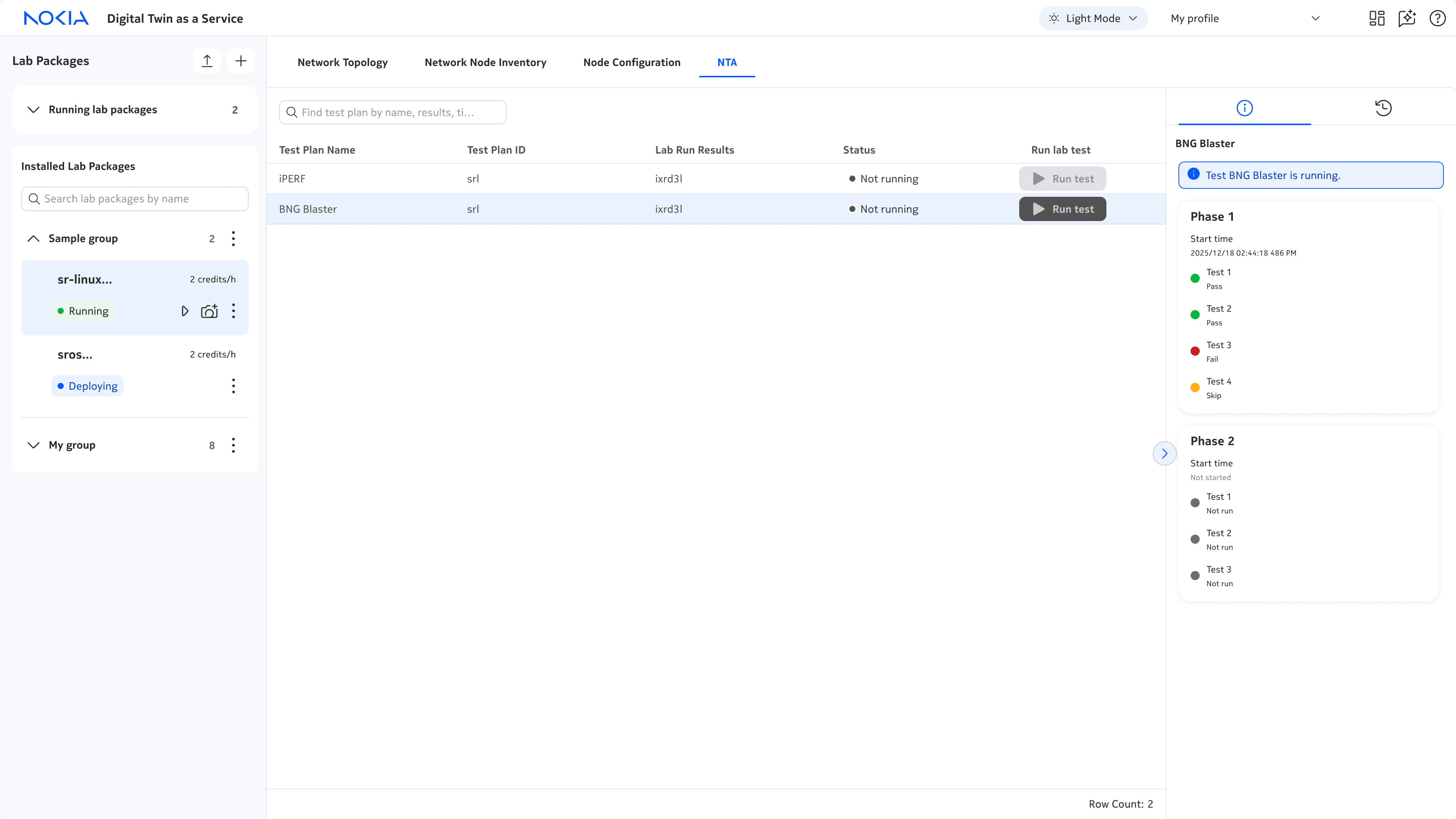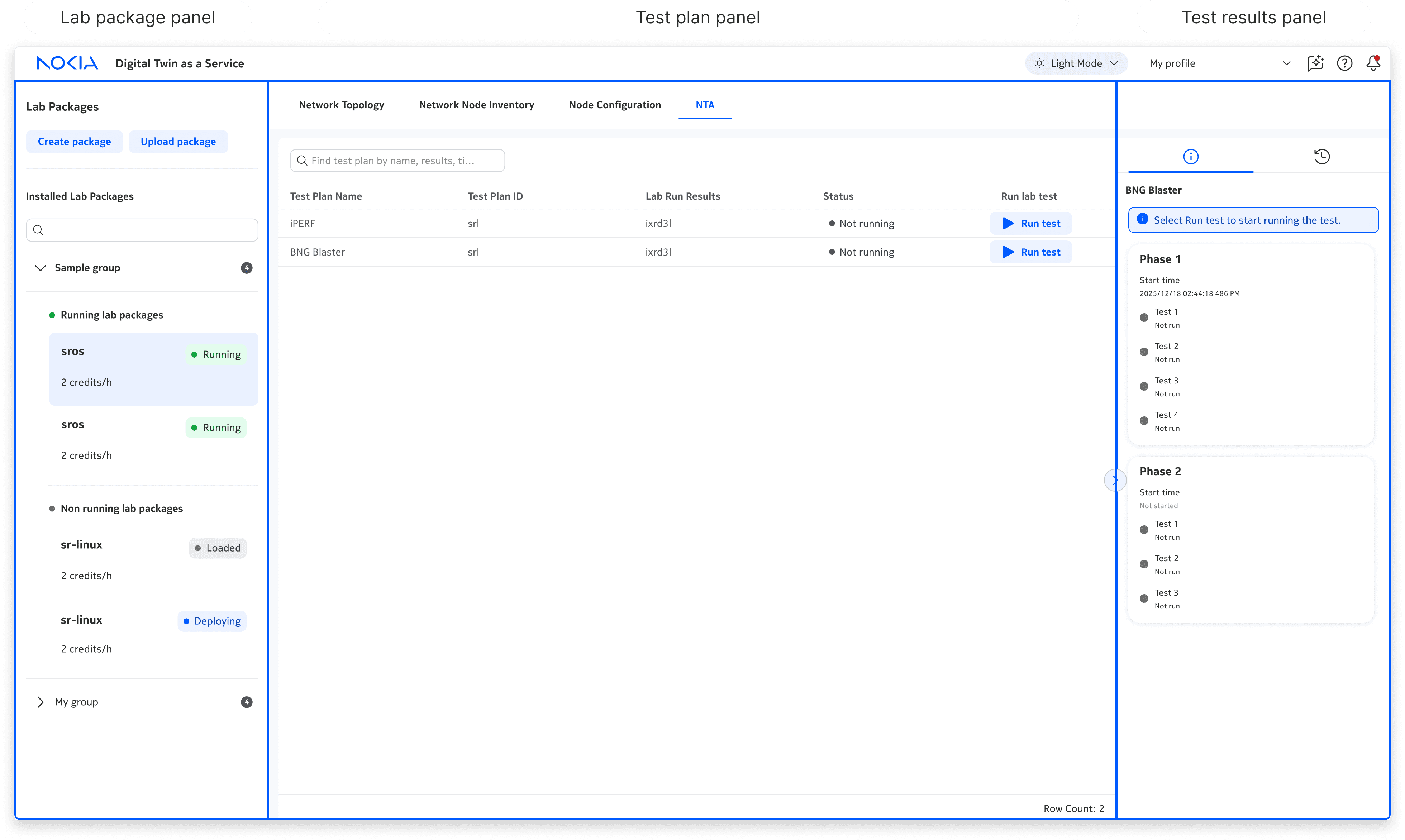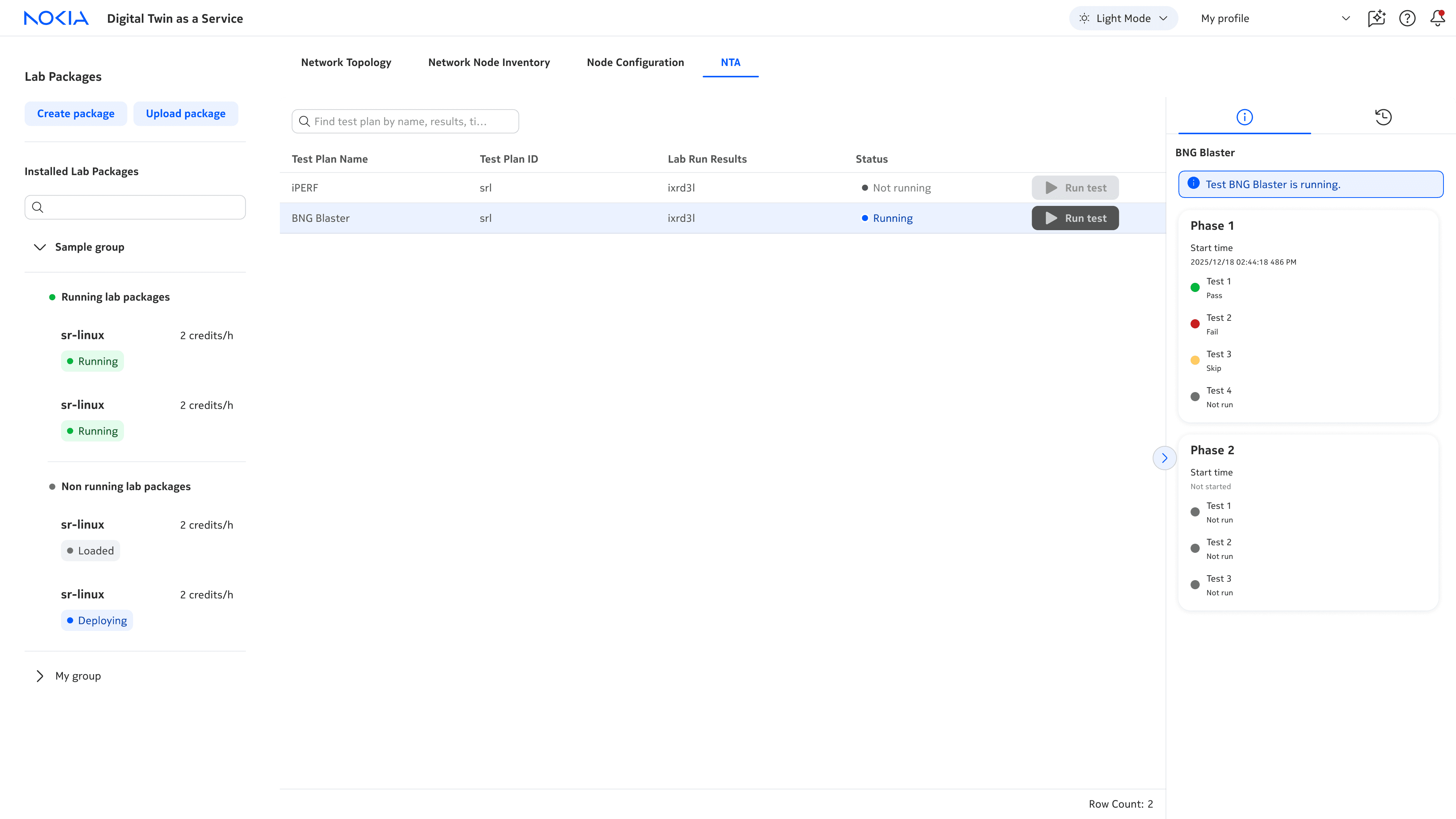 The NTA (Network Testing Automation) page was designed around the network testing mental model. This starts with selecting a lab package and test plan, then running and monitoring the test and results.