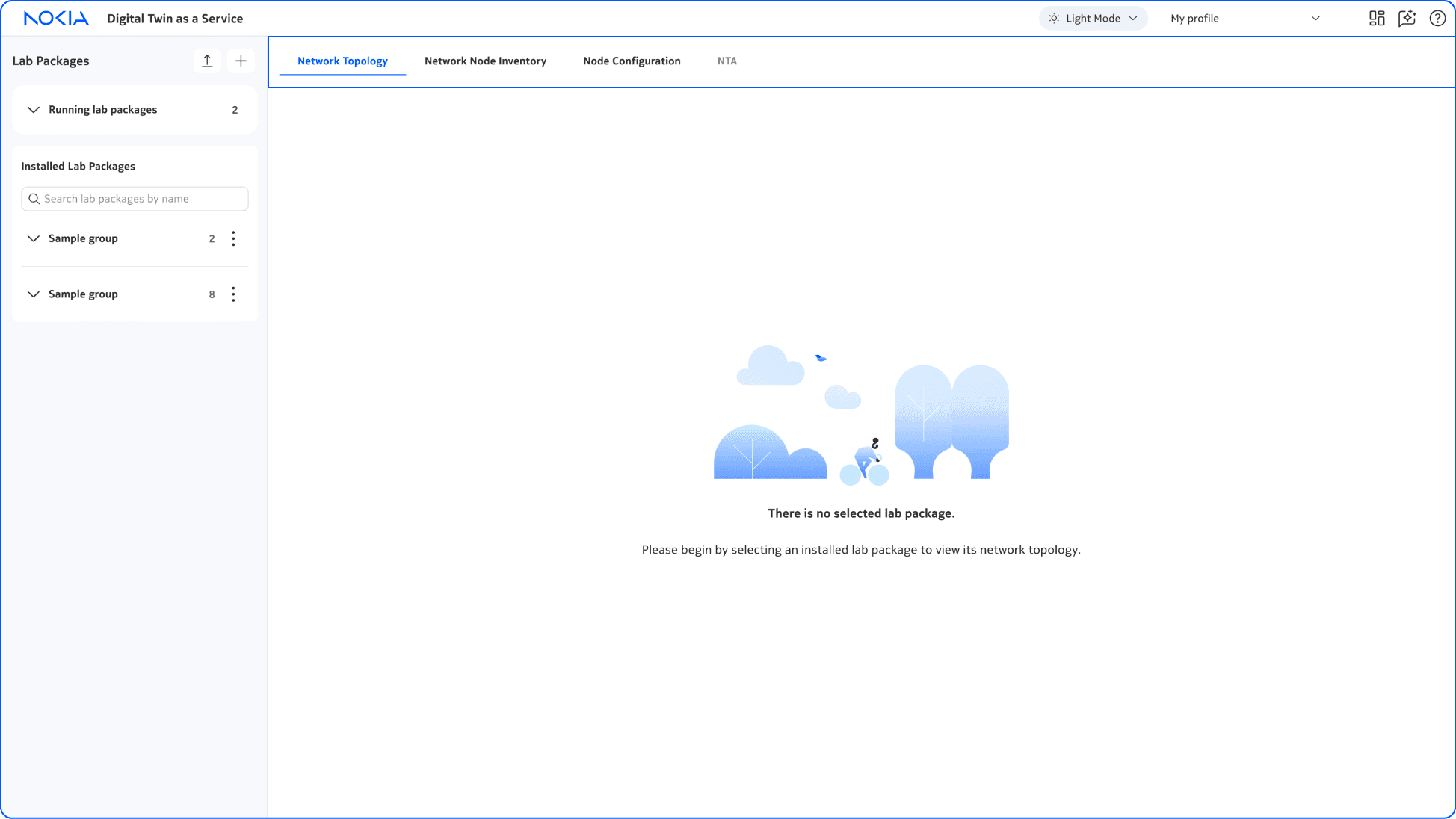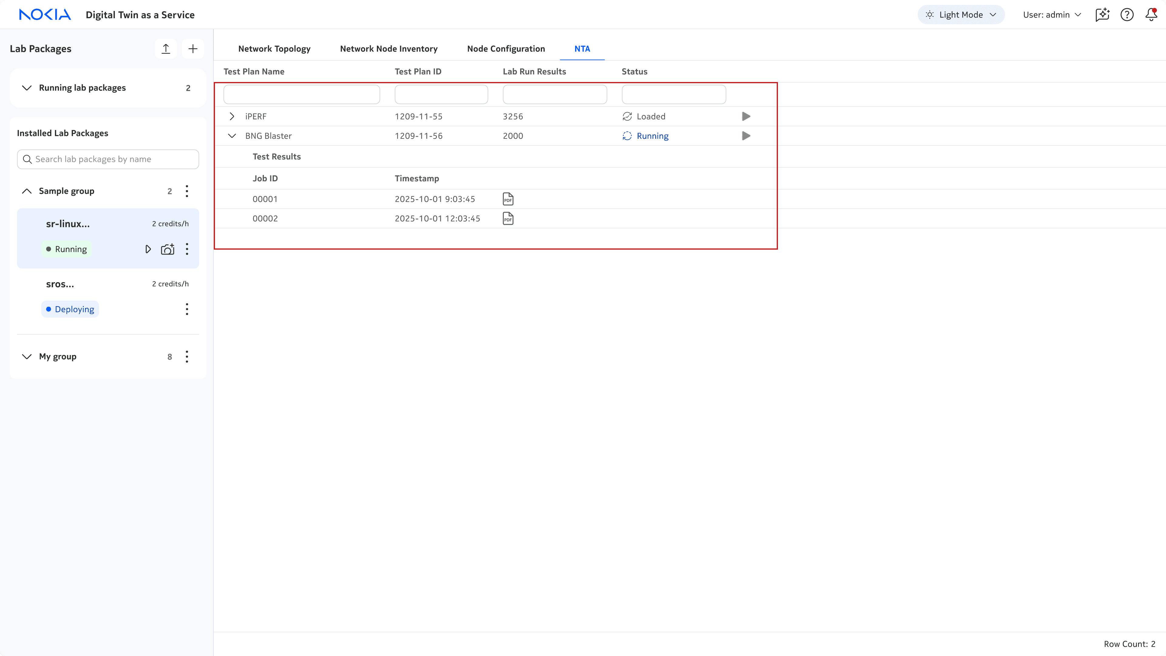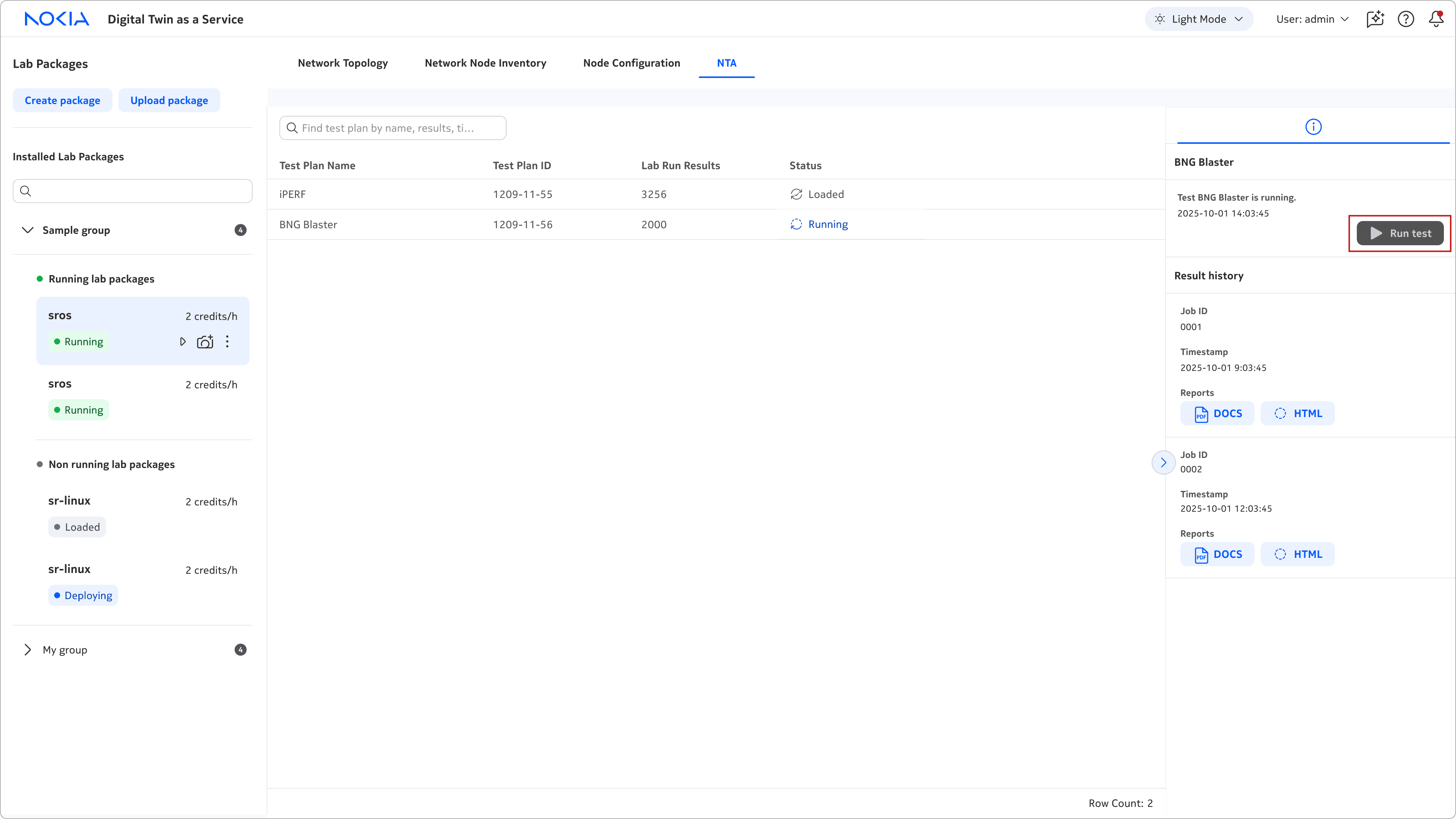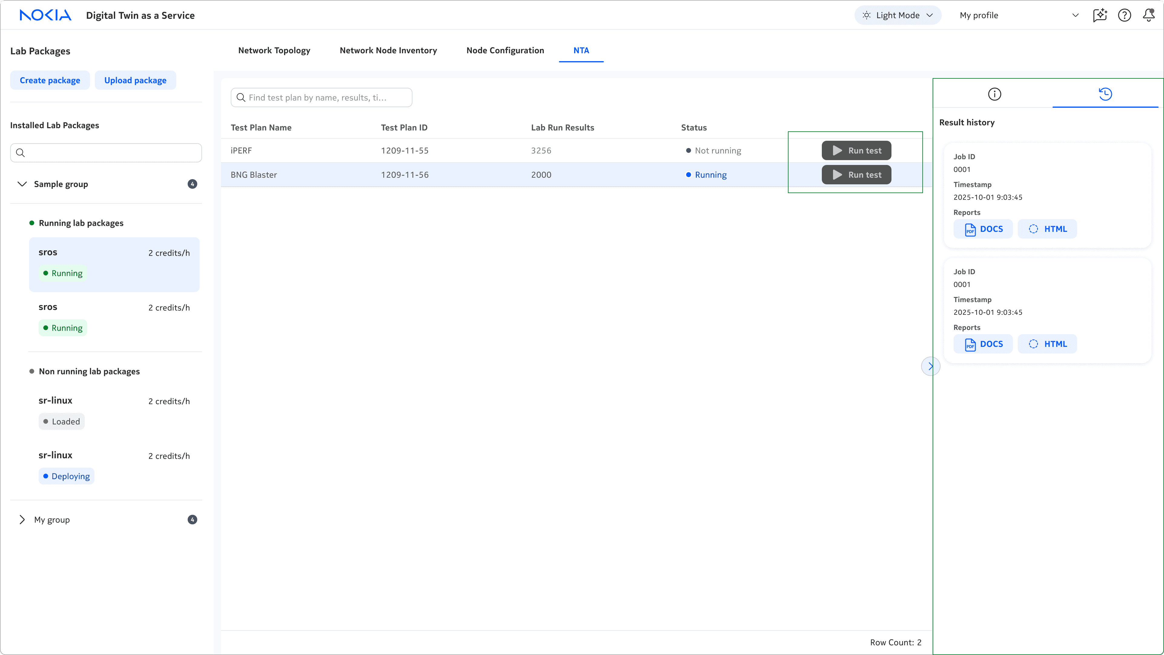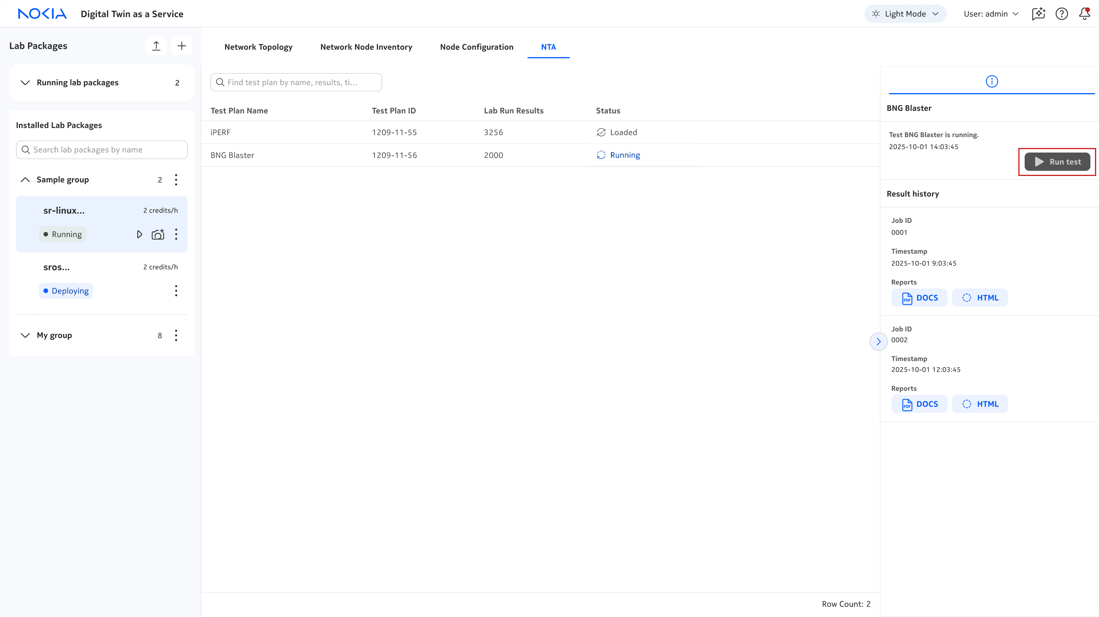 The NTA (Network Testing Automation) page was designed around the network testing mental model. This starts with selecting a lab package and test plan, then running and monitoring the test and results.