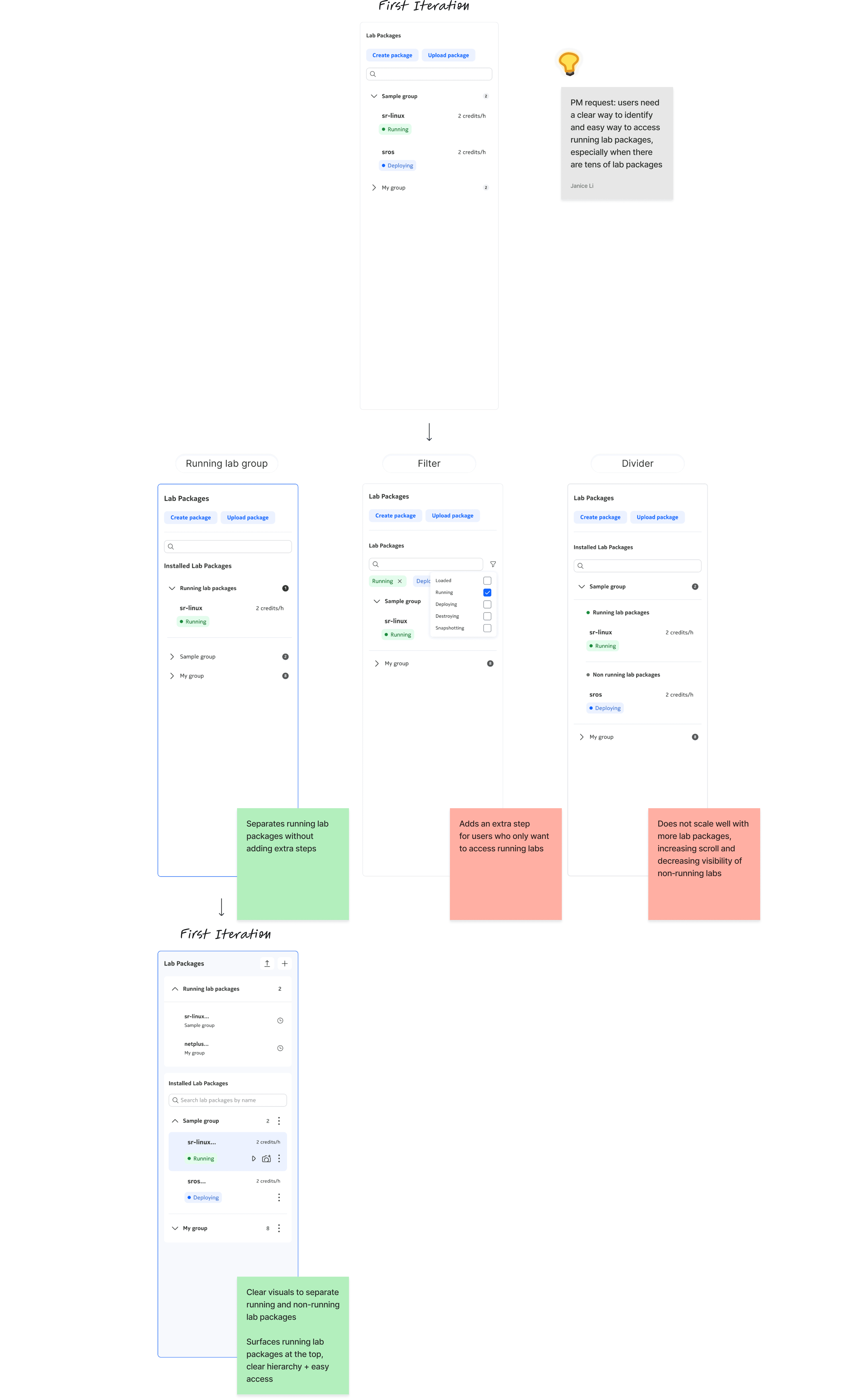 Here's some examples of explorations I took to get to the current lab package panel! I focused on organizing lab packages in groups and surfacing running lab packages.